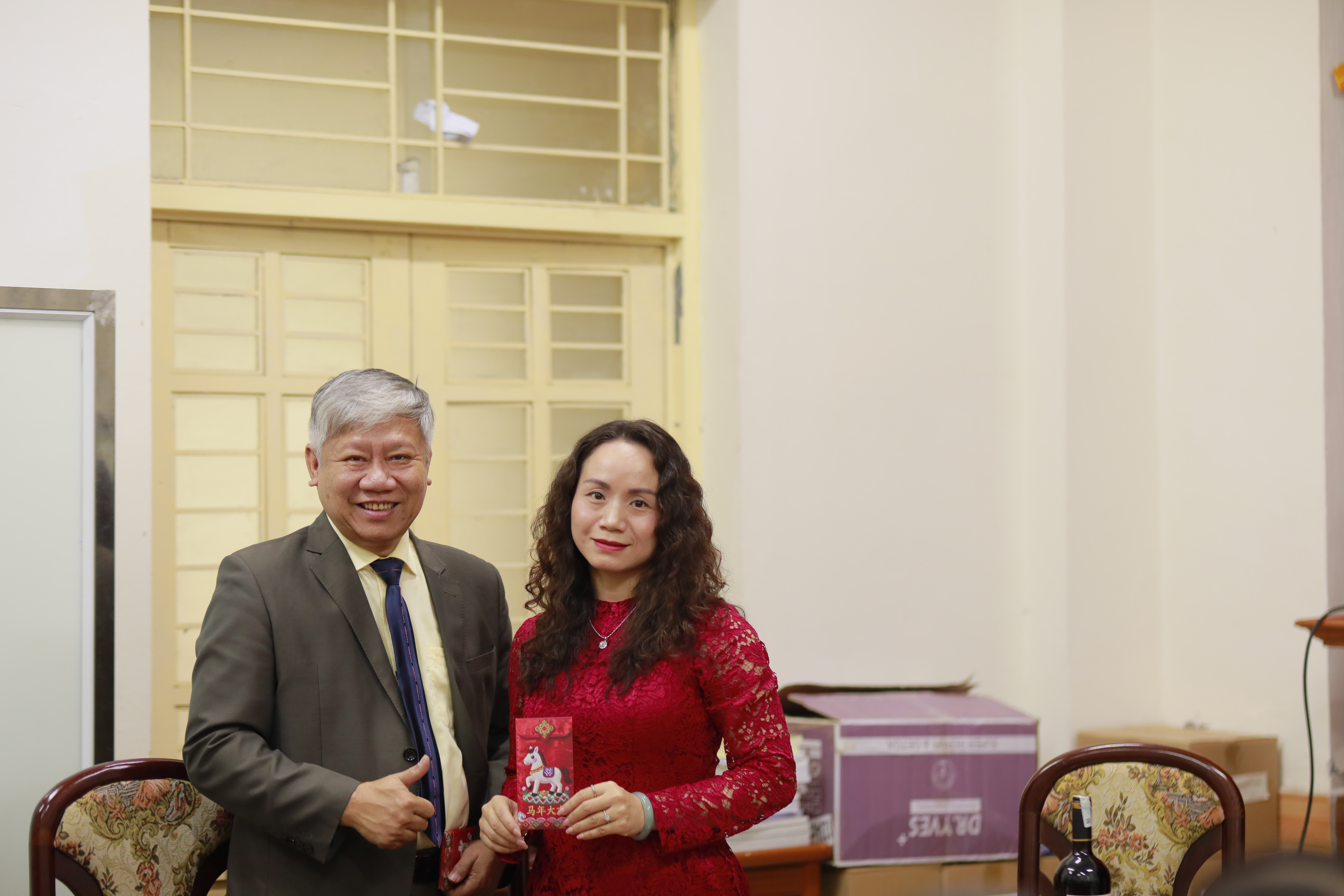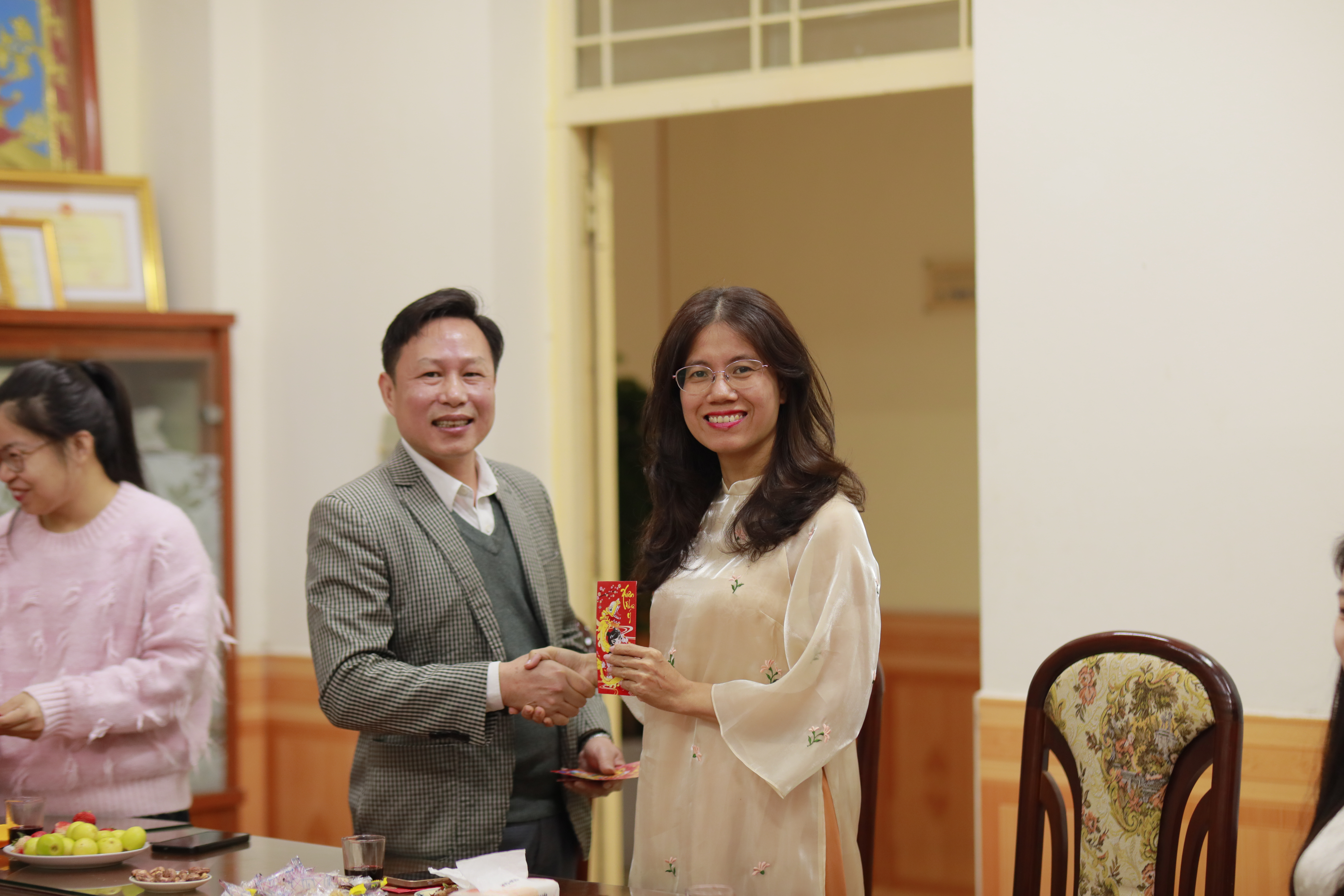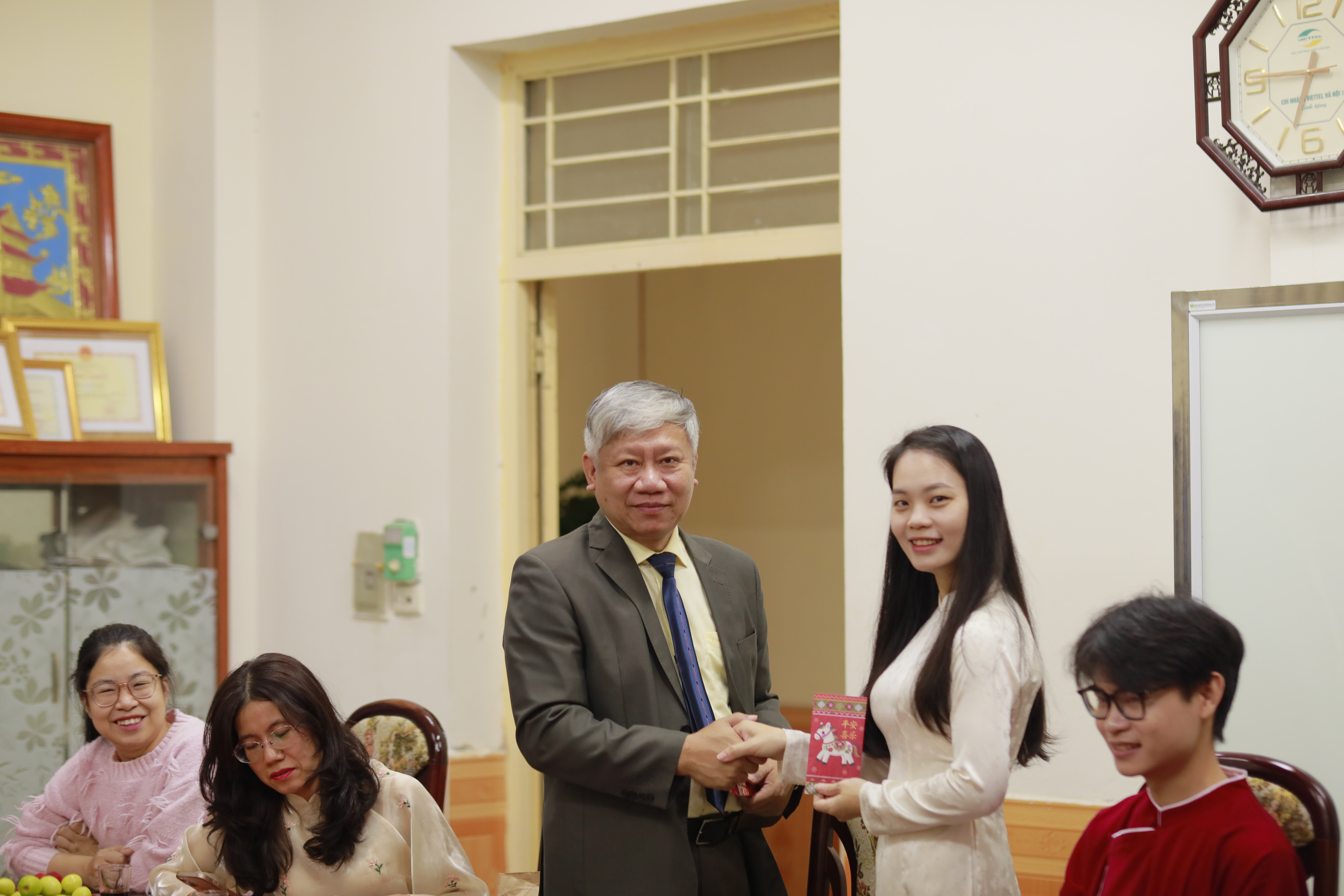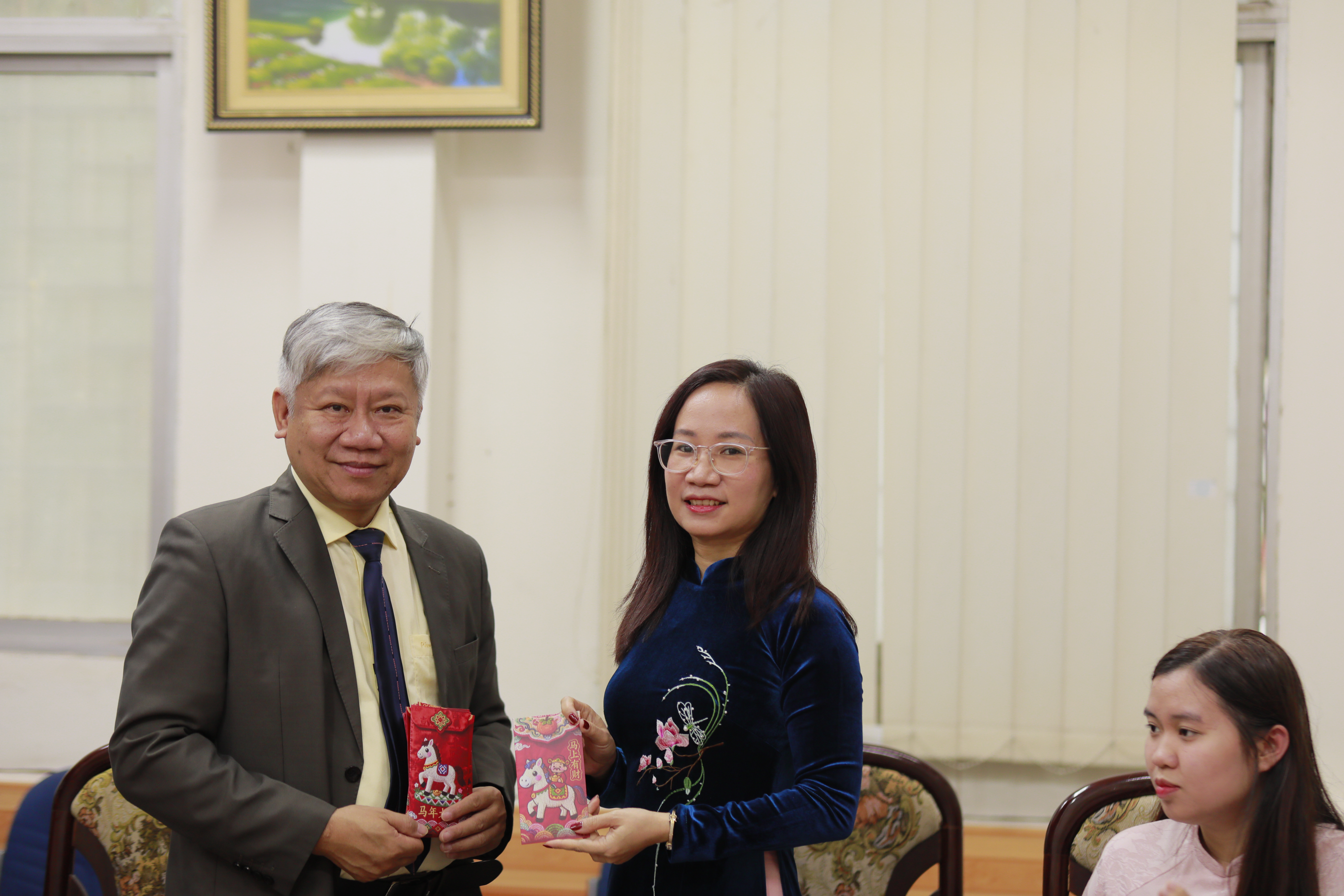 GS.TS. Lê Huy Bắc, Trưởng khoa Việt Nam học trao những phong bao lì xì đỏ may mắn cũng những lời chúc tốt lành tới toàn thể cán bộ, giảng viên trong khoa: